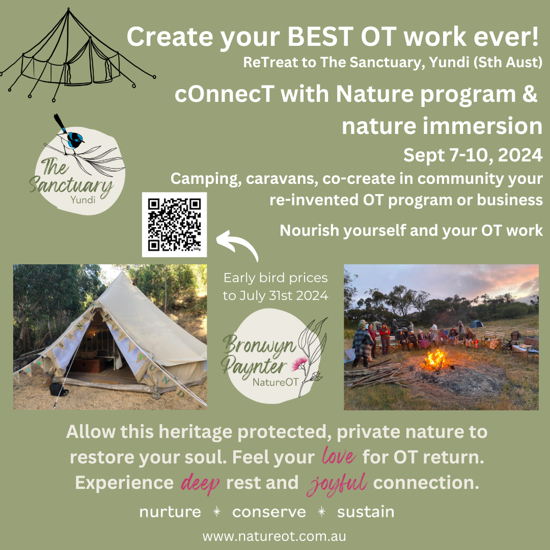 If you want more of this – time with other OTs, and conversation with me then join me at one of our nature retreats on the land we nurture, The Sanctuary in South Australia. I have 2 retreats in September. One specifically for therapists, health care professionals and educators (we all need this) for rest, recovery, relaxation and nurturing. The other one for intentionally working on your OT business and offer, inspired by nature. This is the highest level of access to my time and attention that you will get as we live together for 3-4 days and have as much conversation (or not) as you like. All the details are here on my website, or contact me for a chat.